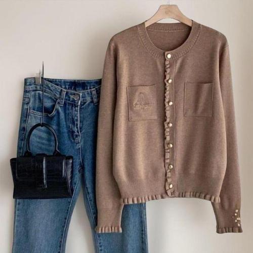 [신상오픈런]여성 자수 더블포켓 프릴 라운드넥 니트 가디건