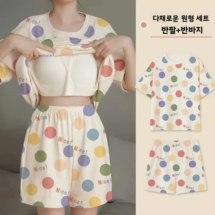 여성 여름 반팔 잠옷 세트 (가슴 패드 포함) 홈웨어 반바지 세트 스윗 고급스러운 캐주얼룩