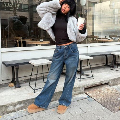 [옷자락] 여성용 겨울 기모 데님 로우라이즈 절개 와이드 팬츠