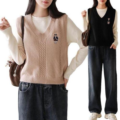 [셀러허브_여성트랜드패션]제니유 포근 여성용 브이넥 곰돌이 자수 니트 조끼 베스트