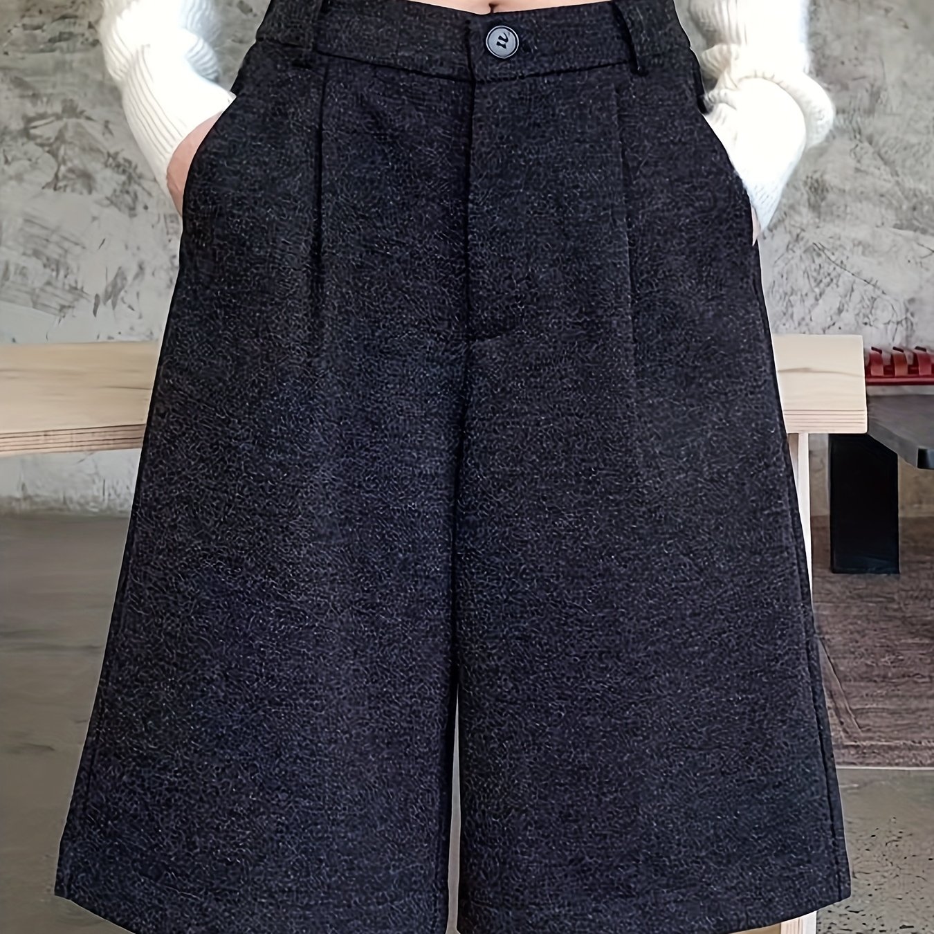 TEMU 여성용 한국 스타일 겨울 반바지 - 우아한 한국 영감 와이드 레그 미디엄 길이 모브 트라우저 (벨트 없음) 포켓 & 지퍼 클로저, 세탁기 사용 가능 논스트레치 다크 그레이/블랙 캐주얼 & 정장용 (가을/겨울)|버뮤다팬츠