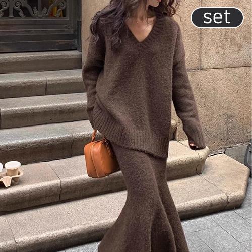 [유니제이] 브떼아 V넥 니트 스커트 SET