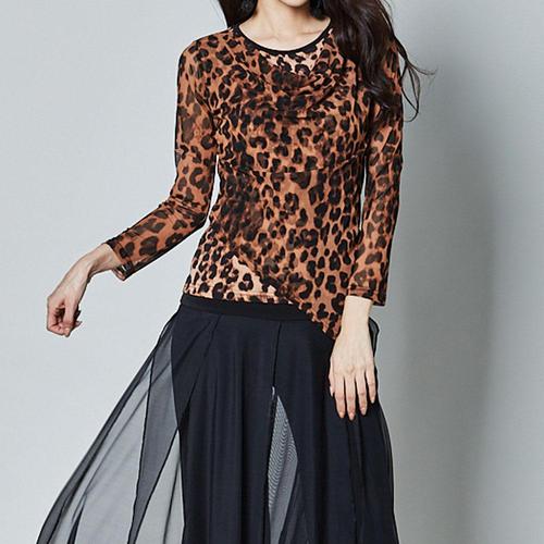 까르죠아 이중 레이어드 호피 블랙 블라우스 여자 여성 라인댄스복 스포츠 티셔츠 소매 망사