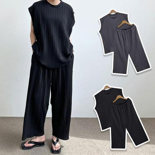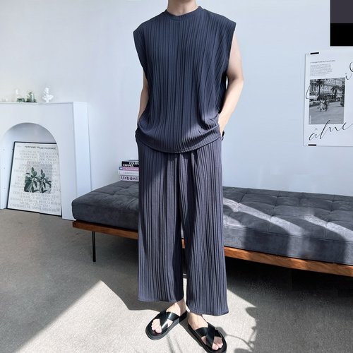 [라일리] Rly 와이드 남자 플리츠세트 밴딩 주름 바지 나시 세트