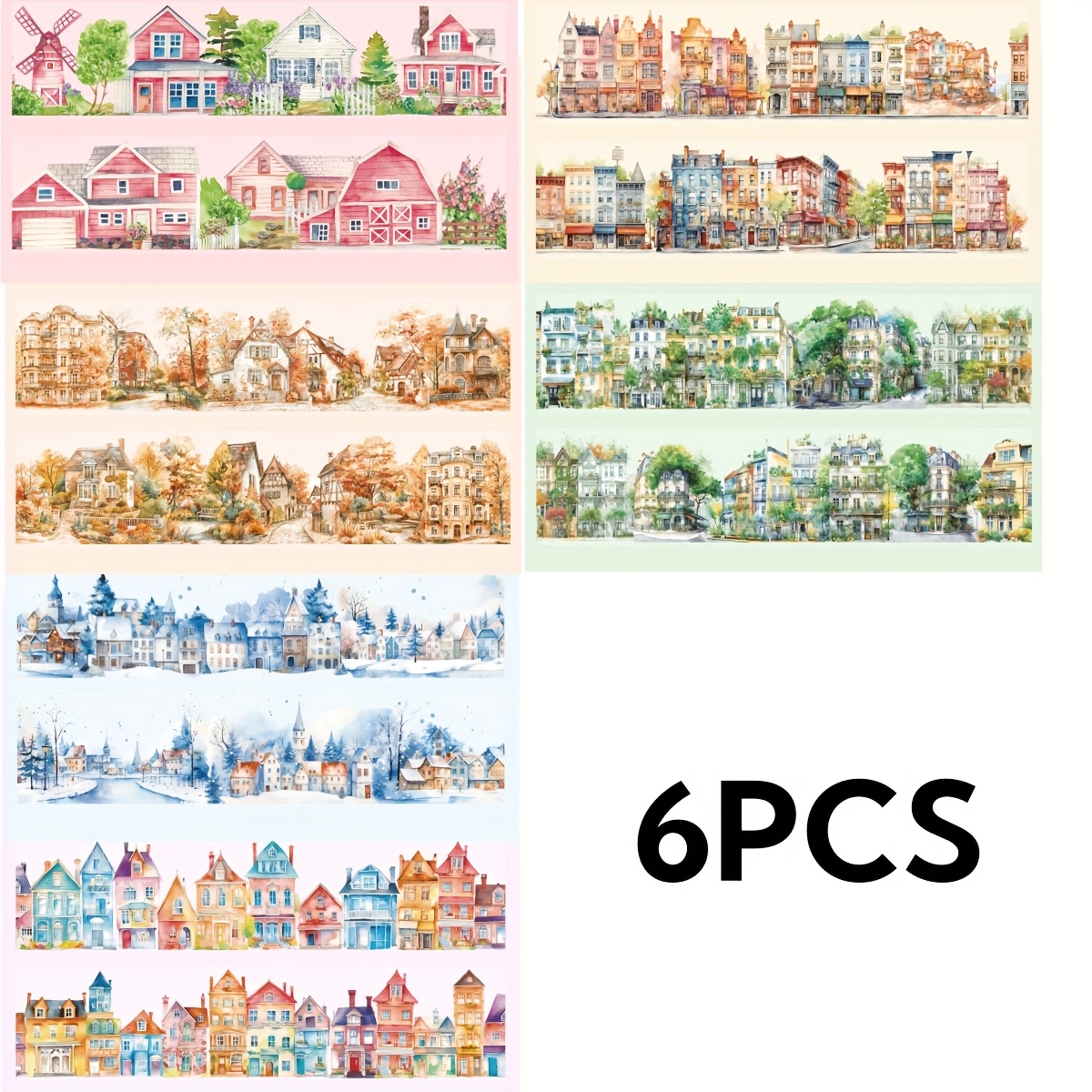 TEMU 6pcs 소도시 테마 PET 테이프 세트 조합 북유럽 소도시 시리즈 - 일기와 수공예용 장식 풍경 디자인, 다양한 장면 휴대 전화 케이스 물 컵 스티커, 사진 앨범 일기 장식 노트 액세서리, 쓰레기 일기 스티커 아트 및 수공예 장식 스티커, 스케치북 용품, 크리스마스 선물