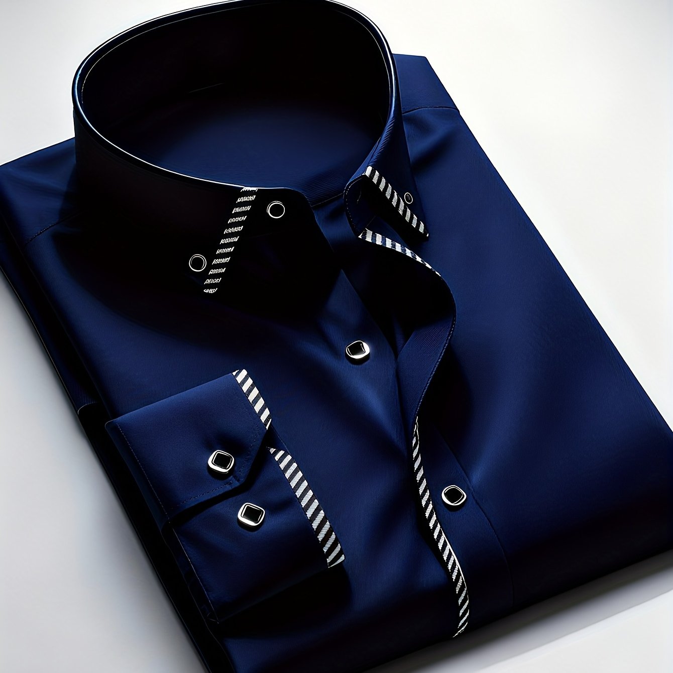 TEMU 남성용 슬림핏 퀵드라이 주름방지 드레스 셔츠 - 헤비듀티 사계절 비즈니스 & 정장용, 네이비 블루/블랙 칼라, 화이트 버튼 프론트, 세탁기 사용 가능한 테일러드 슈트 재킷 동반 (단색 전문복)
