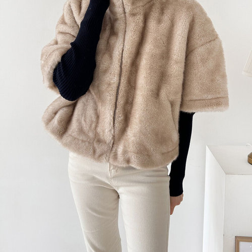 에르디테 / 페이크 퍼 하이 카라 넥 반팔 집업 지퍼 자켓 아이보리 블랙