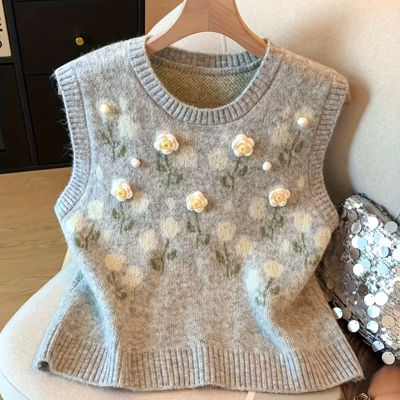 TEMU 여성용 빈티지 플로럴 스웨터 조끼 - 3D 꽃 디자인, 다크 그레이/블랙/화이트/베이지, 라운드 넥 탑, 가을/겨울 의상용 - 매일의 공식 행사에 적합한 시크한 추운 날씨 의류, 레트로 패션, 핸드메이드 룩, 스타일리시 탑, 패션 애호가, 가을 패션, 내구성 있는 소재, 여성용 대형 크롭 카디건, 슬리브리스 카디건, 베스트