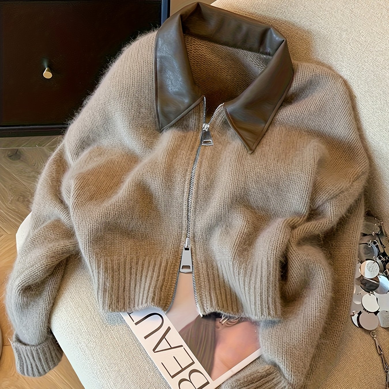 TEMU 여성용 2025 가을 겨울 신상 숏 소프트 코지 더블 지퍼 빈티지 카디건 스웨터 라펠 롱소매