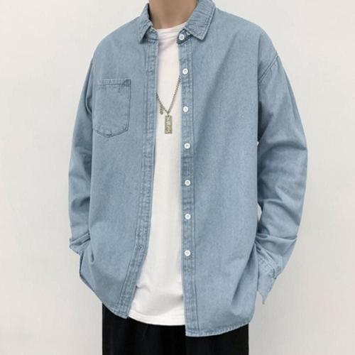 SMOPIG 남성데님셔츠 워싱 춘추 긴 소매 투 포켓 카고 데님 널찍하다 그러데이션