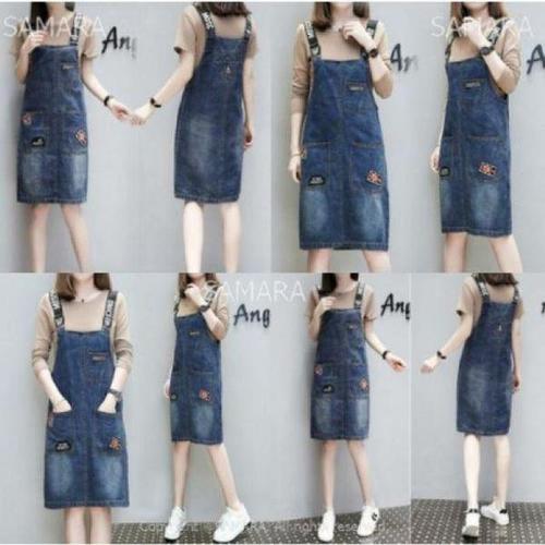 [옷자락] 여성 키치무드 루즈핏 사각패치 멜빵 청 롱 드레스