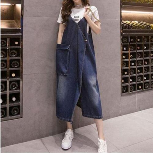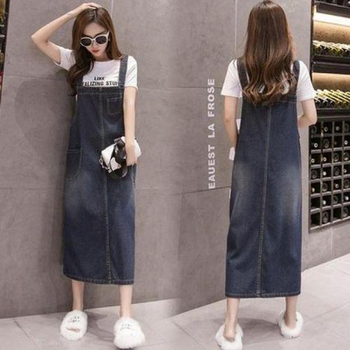 SAHINER 여름 여성 루즈핏 롱스커트 연청 멜빵 데님 힙업원피스 LWAQZ19