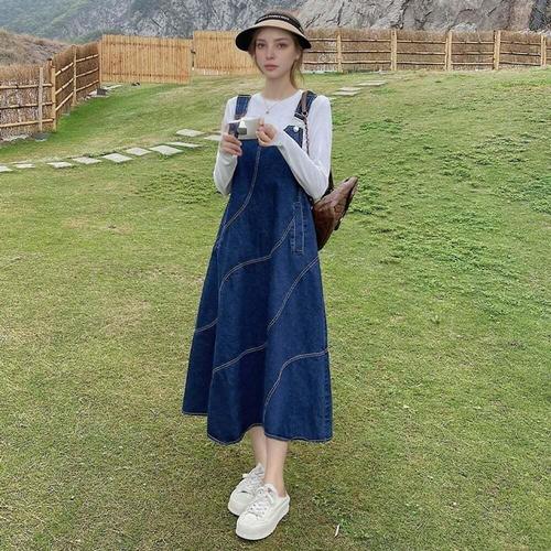 [에미트] 데님 멜빵 원피스 미디원피스 롱원피스 멜빵치마 청멜빵 데님원피스