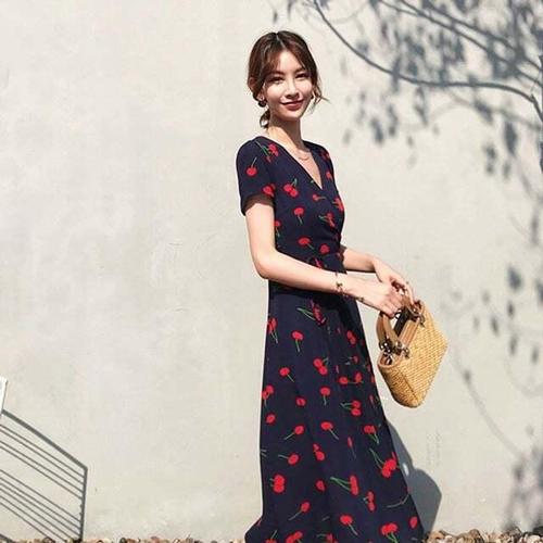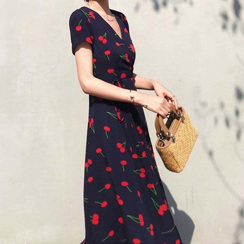 여성반팔롱원피스 1P 브이넥 체리 여름 여자 치마