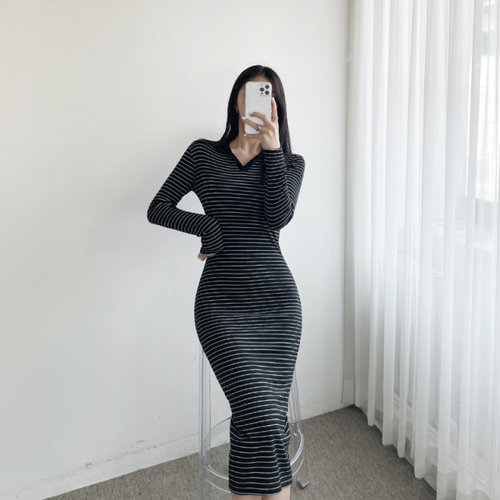 글램핏 / 스트라이프 슬림핏 카라 브이넥 롱 미니 원피스
