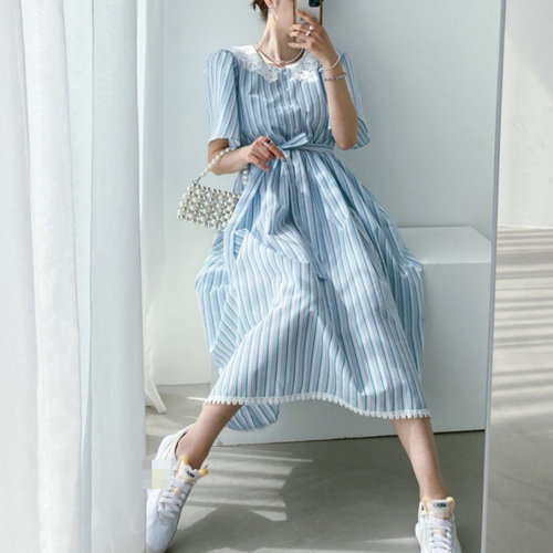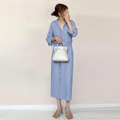 여름 롱니트 원피스 스트라이프 셔츠 플레어 휴 WFKPDMX