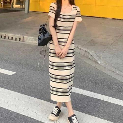 [셀러허브_여성트랜드패션]ONM 핏 스트라이프 골지 니트 롱 원피스 단가라