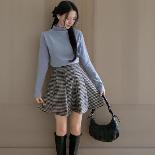 [신상오픈런]여성 체크 패턴 핀턱 미니 플레어 스커트