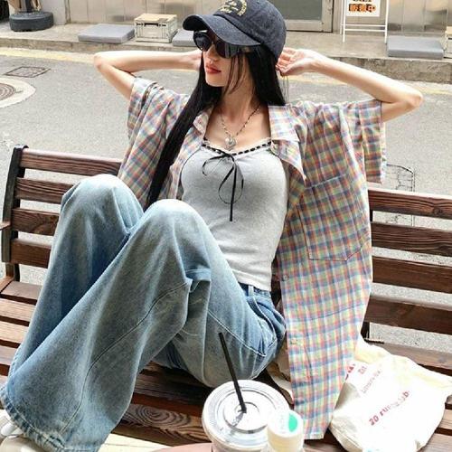 엘케이트 여자 반팔 체크남방 셔링셔츠 스트랩 여름 체크 레트로 슬림 남방 LCR117