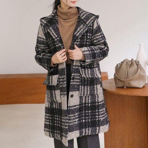 [베아뜨리체]겨울 체크 패턴 반후드넥 누빔 패딩 롱 코트 BPWHC8010