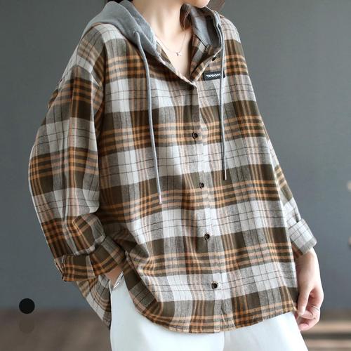 나바바 / NB2973 여성 캐주얼 레트로 체크 긴팔 후드 셔츠