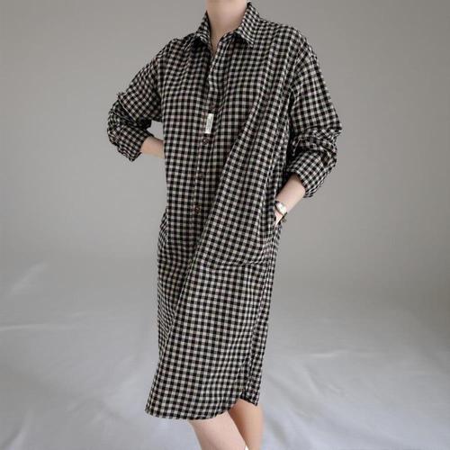 [옷자락]여성 체크무늬 시스루 롱 스커트 밴딩 디자인