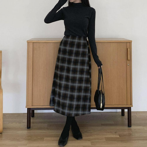 [신상오픈런]여성 레이온 스판 체크 H라인 롱 스커트 뒷트임