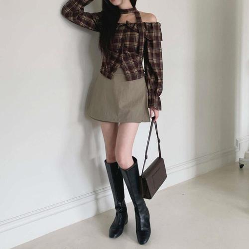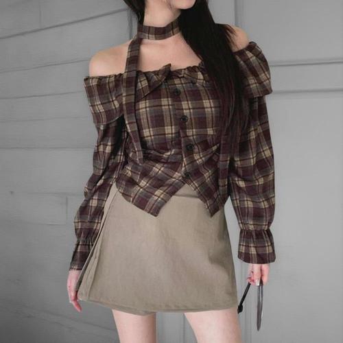 [신상오픈런]여성 체크 패턴 언발란스 오프숄더 블라우스 초커 스타일