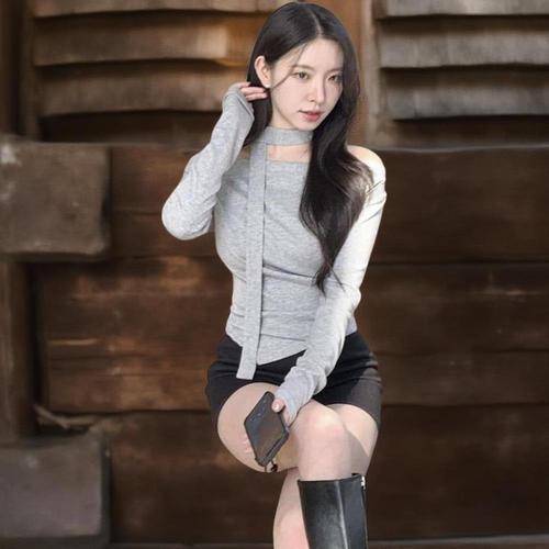 [옷자락]여자 초커 오프숄더 슬림핏 옆셔링 긴팔 니트