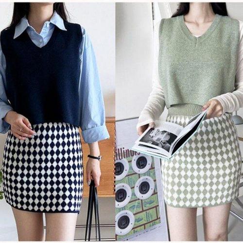COSYEVNO 여성 니트조끼 가을 브이넥 체크 트렌디한 루즈핏 캐주얼 아카데미 쇼트 나시 CXJmj-03
