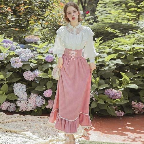 화이트 레트로 투피스 세트 복고풍의상 핑크치마 WFKPDSF
