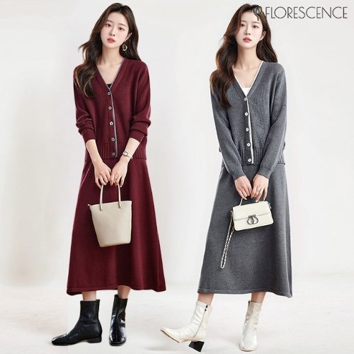 배색 카라 니트 스커트 투피스 세트 MFNC-040135