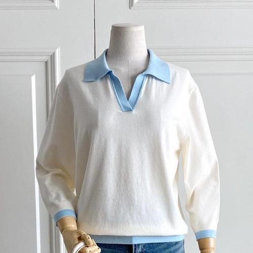 여자 꽈배기 버튼 시보리 칠부반팔 카라넥 니트