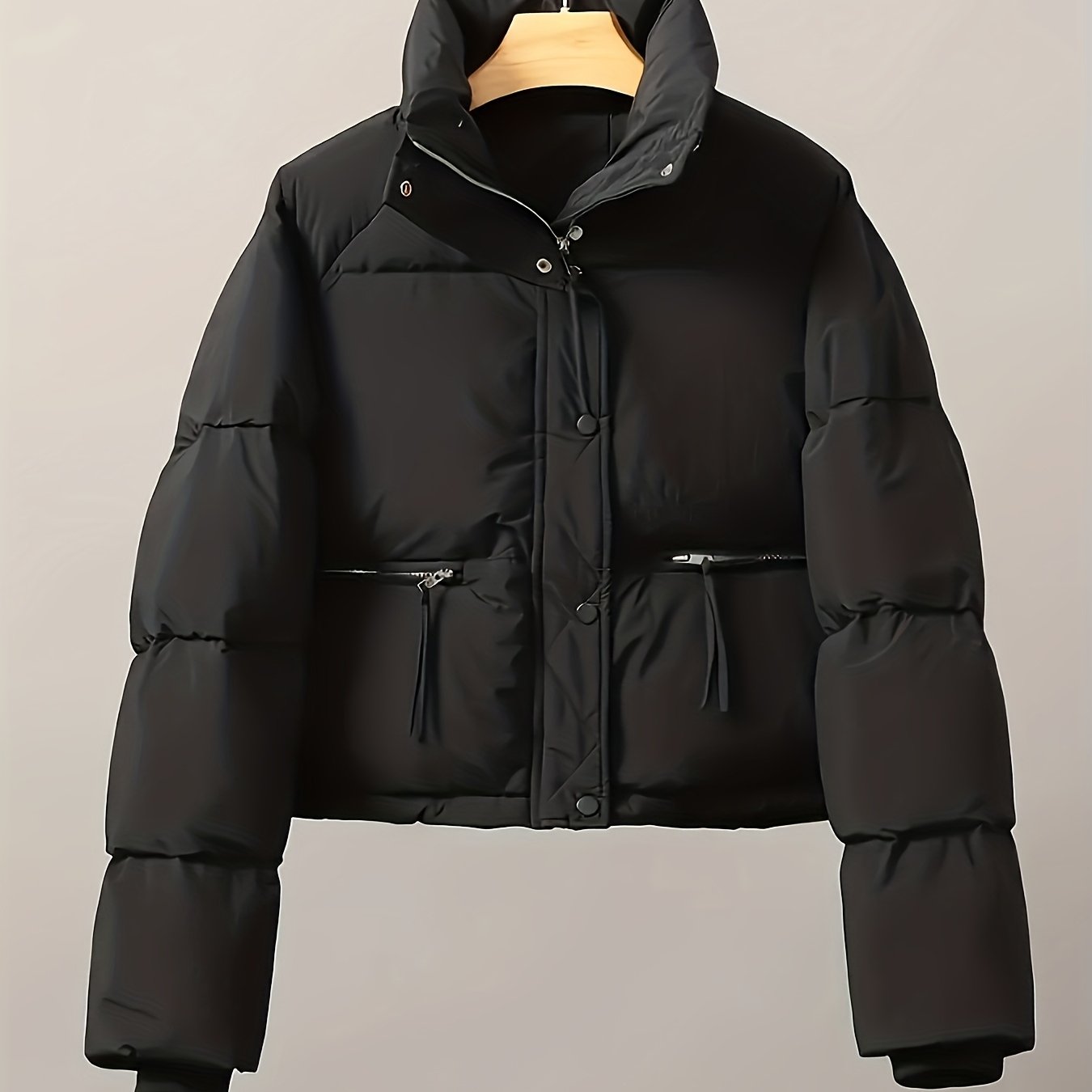 TEMU 가을 겨울 여성용 솔리드 컬러 두꺼운 보온 자켓, 스탠드 칼라 숏 스타일, 실용적인 지퍼 포켓, 패셔너블하고 키 높이 자켓, 출퇴근, 야외 작업, 일상복에 적합