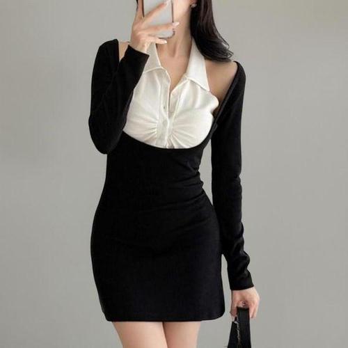 [신상오픈런]여성 셔링 디테일 카라 민소매 레이어드 미니 드레스