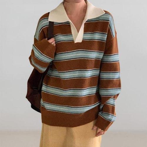 [옷자락]여성 겨울 배색 카라넥 스트라이프 럭비 티셔츠 루즈핏 레드 니트
