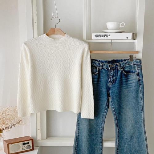 [미라클세븐]여성 기본 웨이브 디자인 솔리드 컬러 긴팔 니트