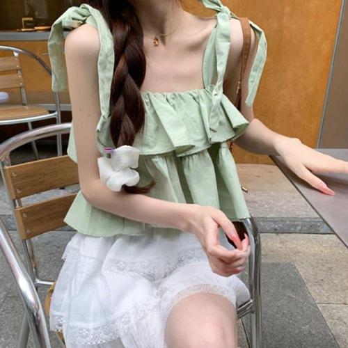 bns 러블리한 프릴 나시티 어깨끈 리본 캉캉 블라우스 WFLRNBA