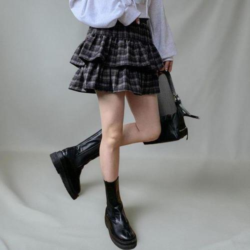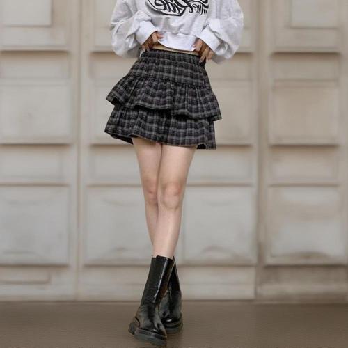 [신상오픈런]여성 체크 패턴 캉캉 프릴 미니 스커트 면혼합 디자인