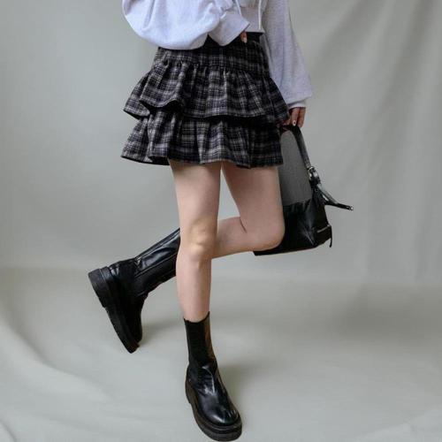 [신상오픈런]여성 체크 캉캉 미니 스커트 면혼합 프릴 디자인
