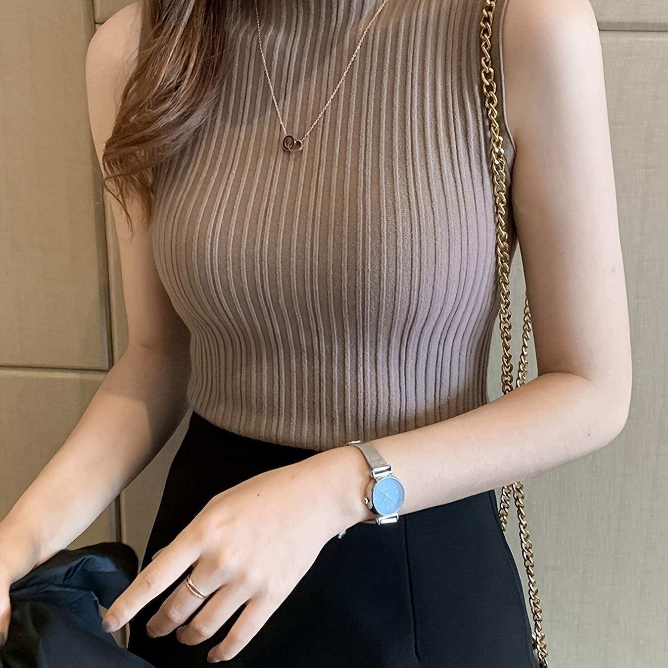 TEMU 여성용 섹시 슬림핏 리브드 민소매 탑 - 오프숄더 하이넥 스트레치 레이어링 피스, 봄/가을용 다목적 이너웨어 & 아우터웨어, 단색 기계 세탁 가능, 시즌 패션, 고신축 니트웨어