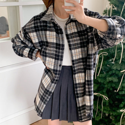 에르디테 / 여성 겨울 두꺼운 셔츠 체크 루즈 오버 핏 롱 커플 룩 4컬러