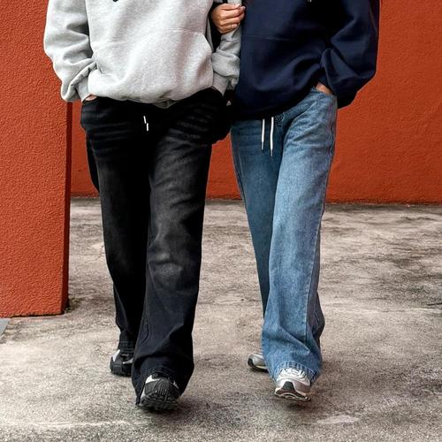 [옷자락]남자 여자 커플 캣워싱 루즈 와이드핏 일자 면 청바지