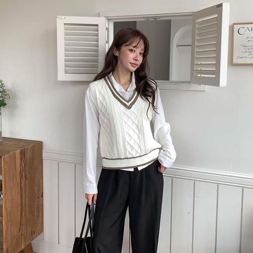[옷자락] 여성 컬러배색 셔츠와 꽈배기 니트 조끼 세트