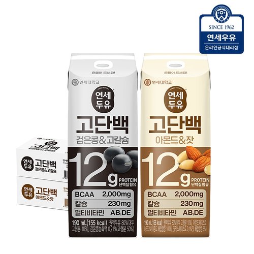연세두유 고단백 두유 190ml x 48팩 (고단백 검은콩고칼슘24팩+고단백 아몬드잣24팩)