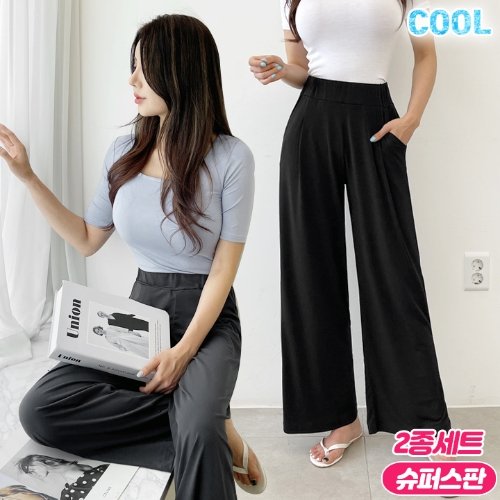 [가비진] 2종세트 여성용 시원한 쿨링 아이스 쫀쫀 스판 밴드 일자 와이드 롱기장 팬츠 바지 여름 쿨바지