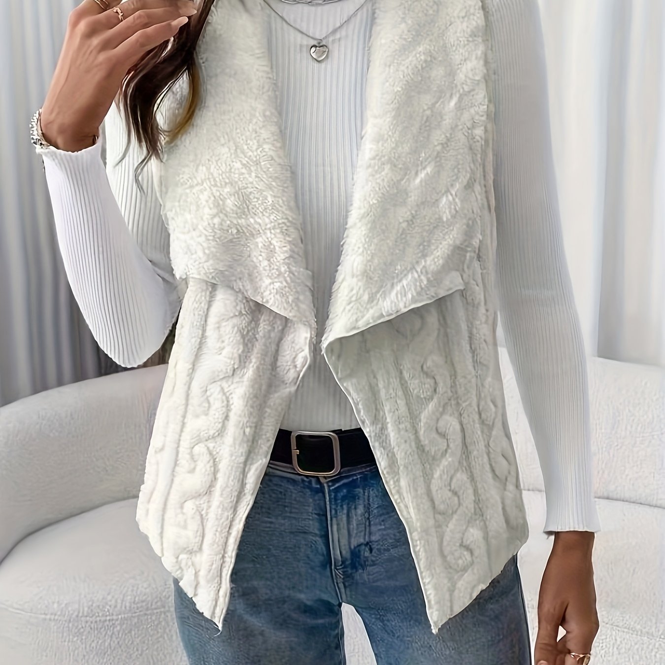 TEMU 여성용 시크한 민소매 인조 퍼 조끼, 비대칭 넥라인 & S자형 질감 - 블랙, 화이트 리브드 롱슬리브 탑, 블루 진, 브라운 벨트 - 스타일리시 가을/겨울 레이어링 피스, 겨울 레이어링 조끼 | 비대칭 넥라인 조끼 | S자형 질감 조끼