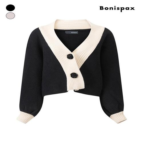 [보니스팍스]배색 V넥 크롭 니트 가디건 (XPBKG008M0)