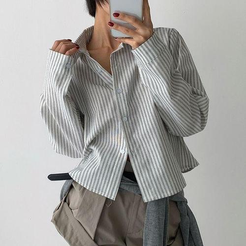 [유야]코튼 스트라이프 셔츠 긴팔 크롭 면 남방 -NB0095H- 빅사이즈 루즈핏 여성 가을