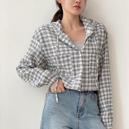 [옷자락]여성 크롭 블라우스 포켓 박스핏 긴팔 후드 체크 셔츠